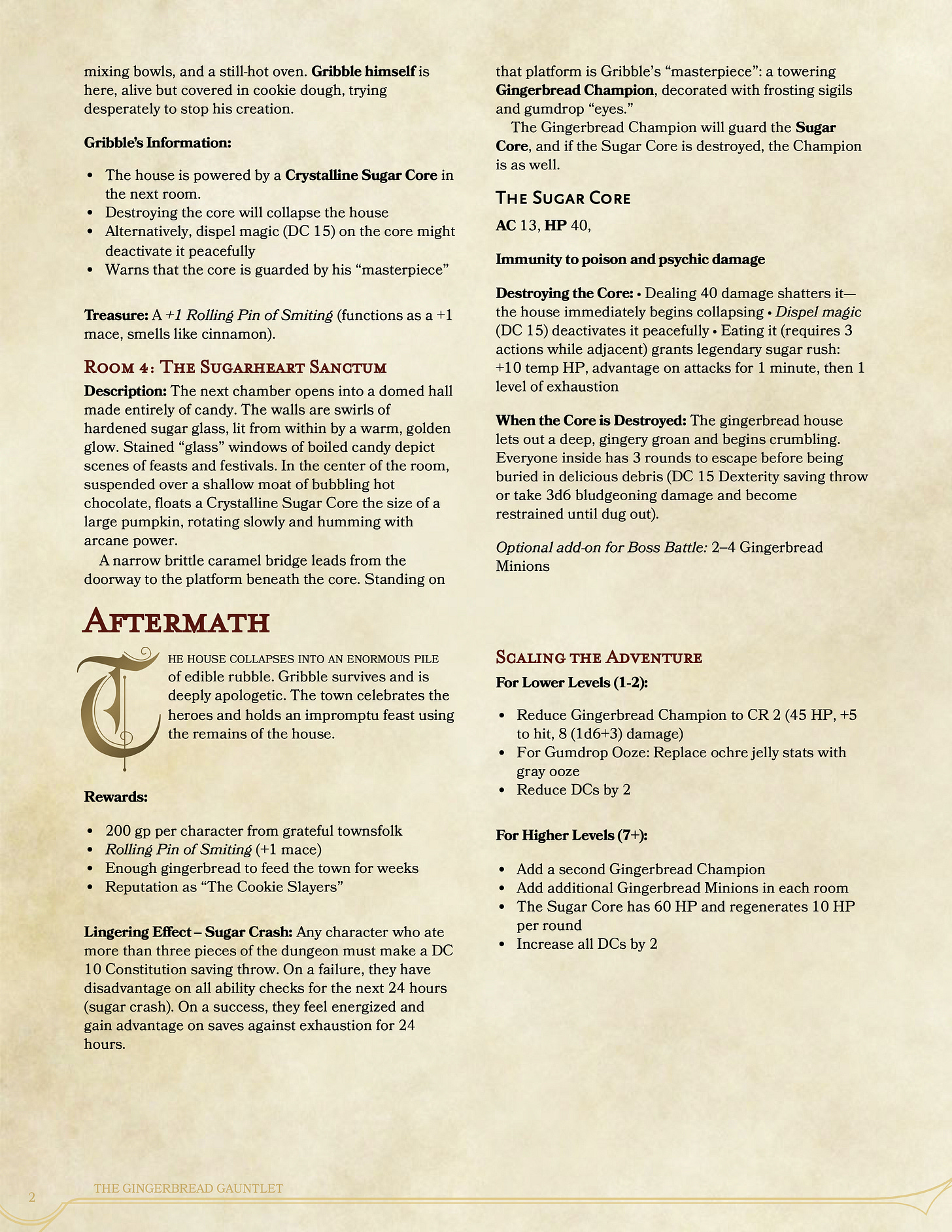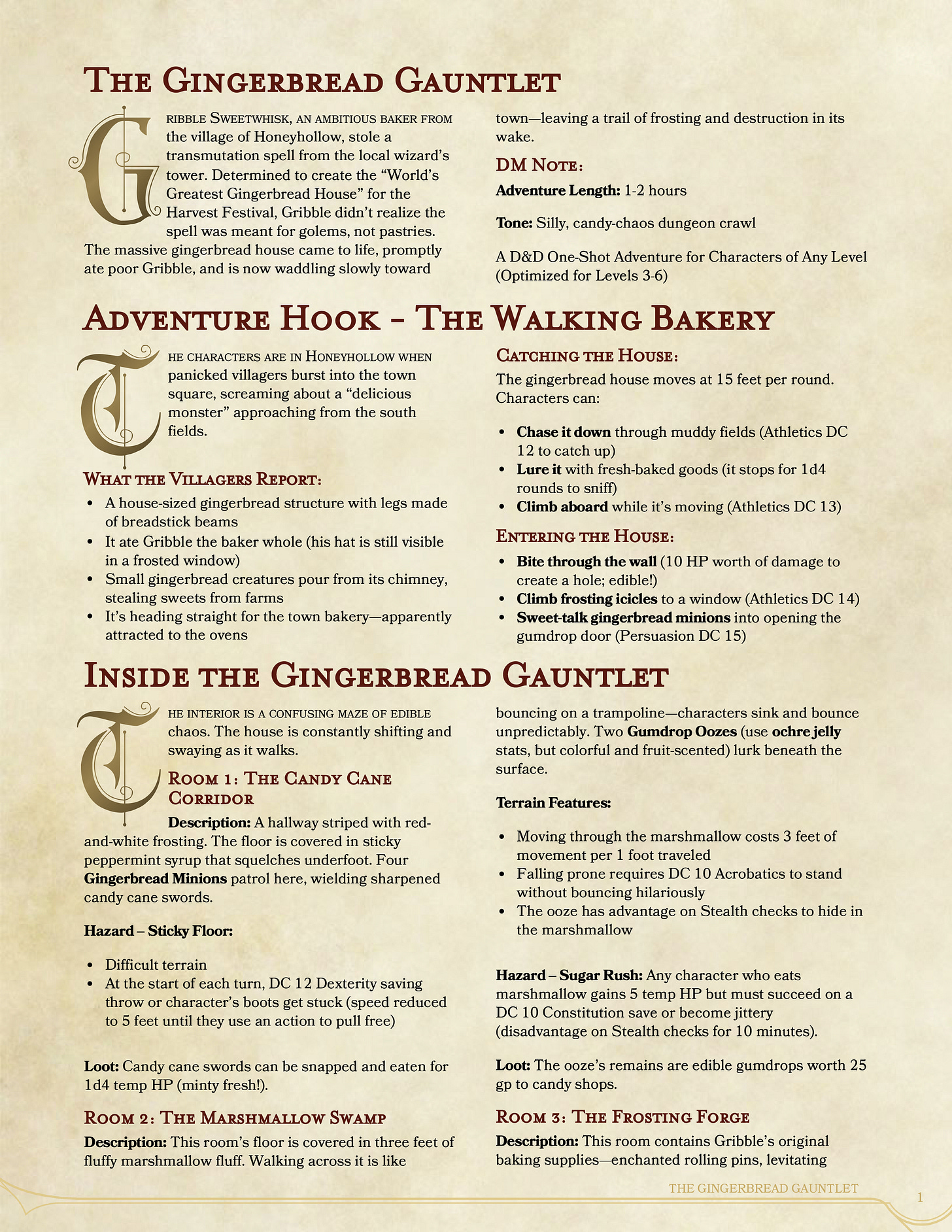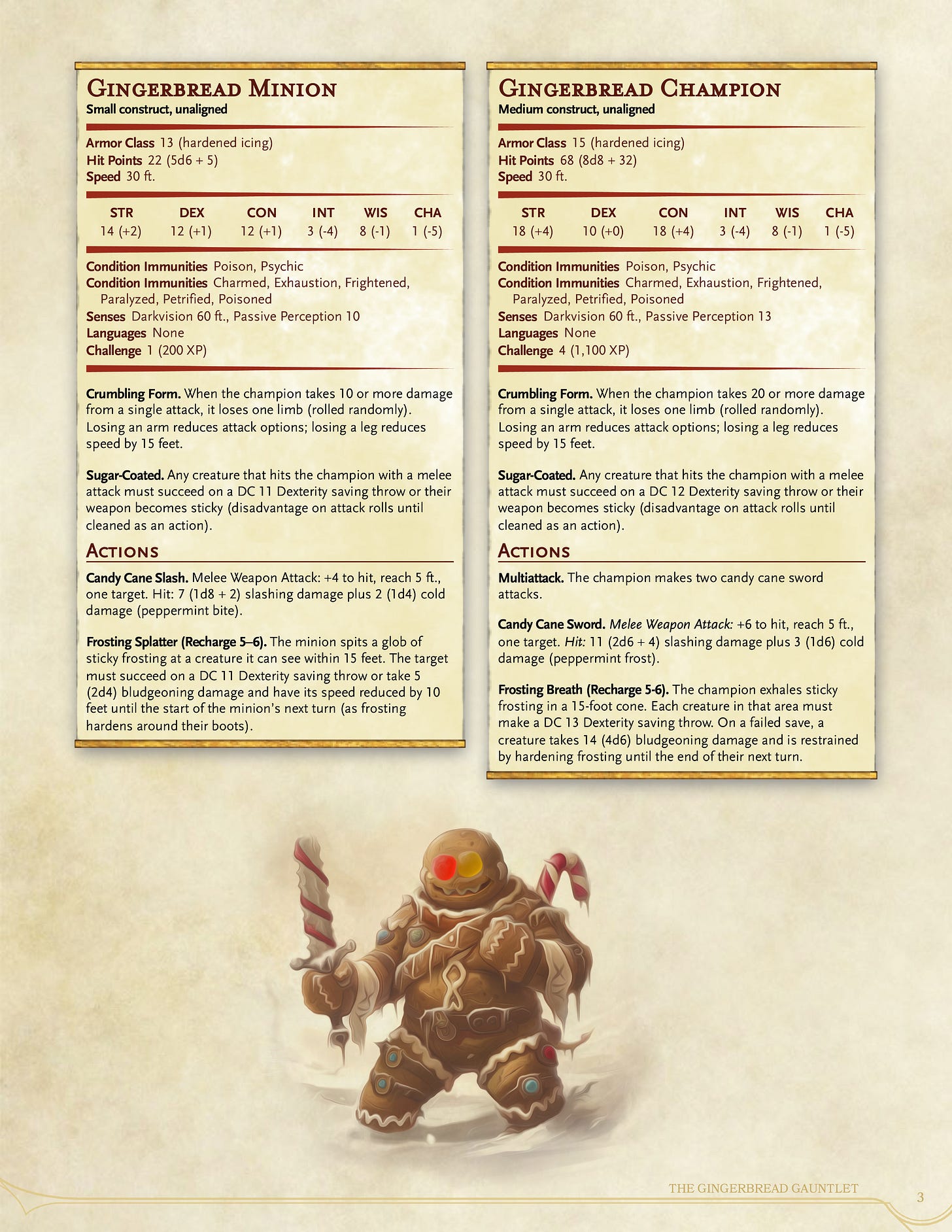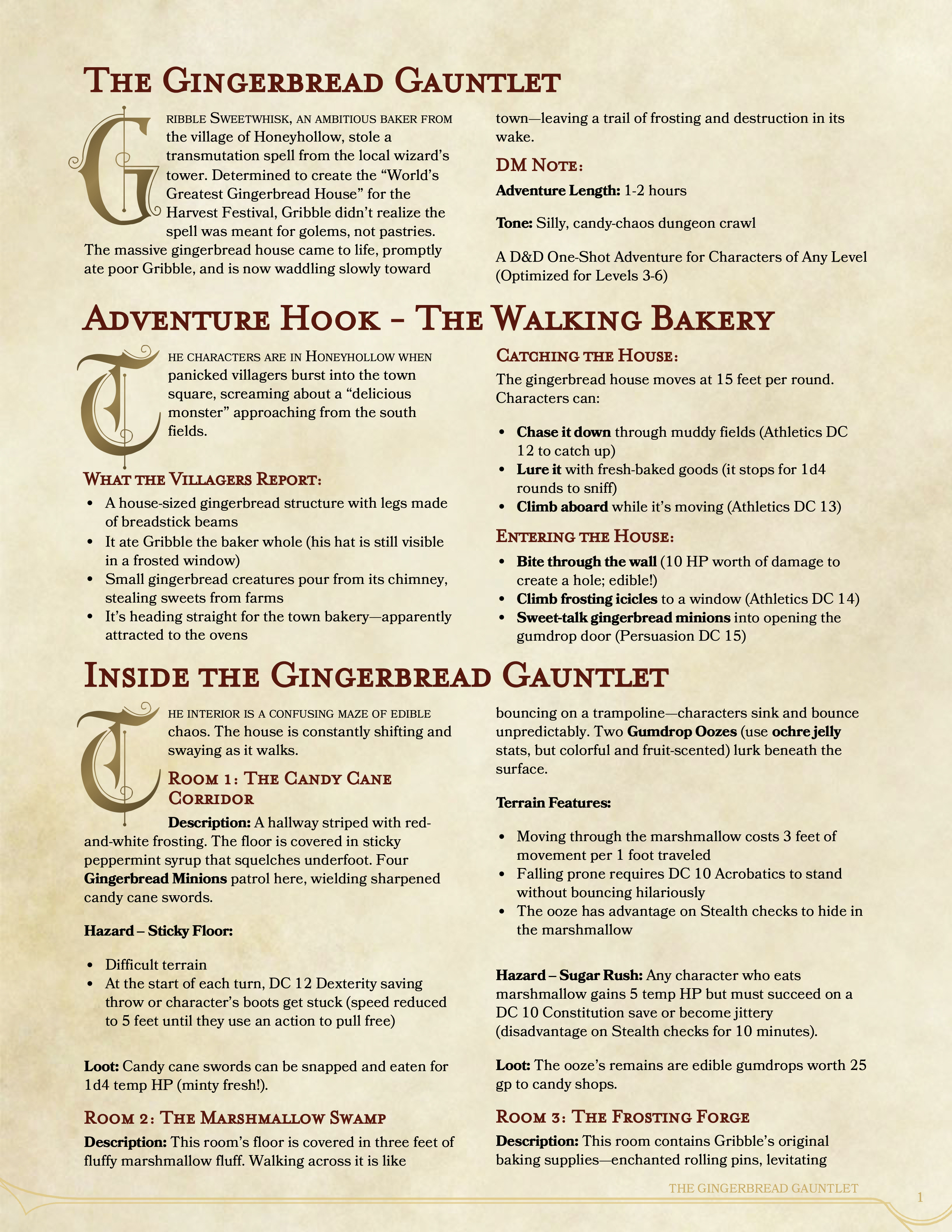 We have a quick holiday adventure for you! We hope you like it. This one is designed for a lower-level party, but can be scaled up if need be. And if features the party fighting their way through an animated gingerbread house!